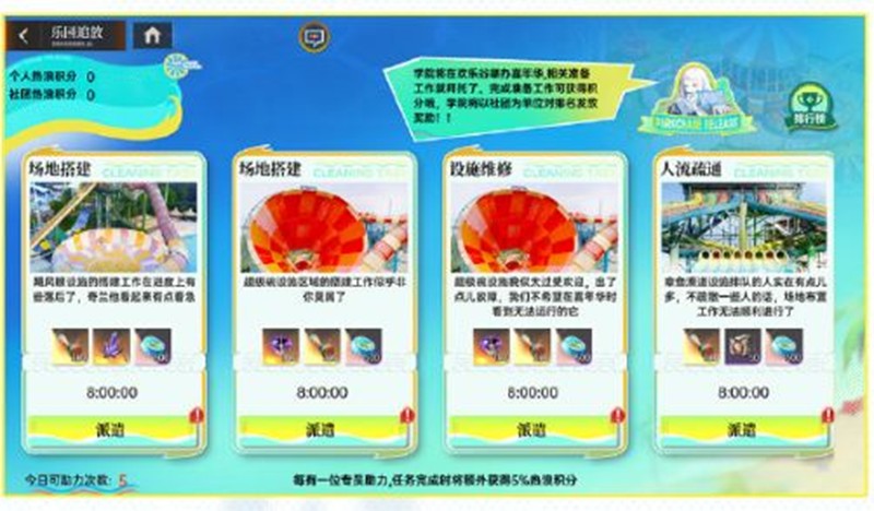 活动期间,专员们可参与学院嘉年华的准备工作,派遣伙伴前往现场完成装饰布置、人流疏通及场地打扫等任务,即可获得相应热浪积分!学院将以社团为单位发放排名奖励!