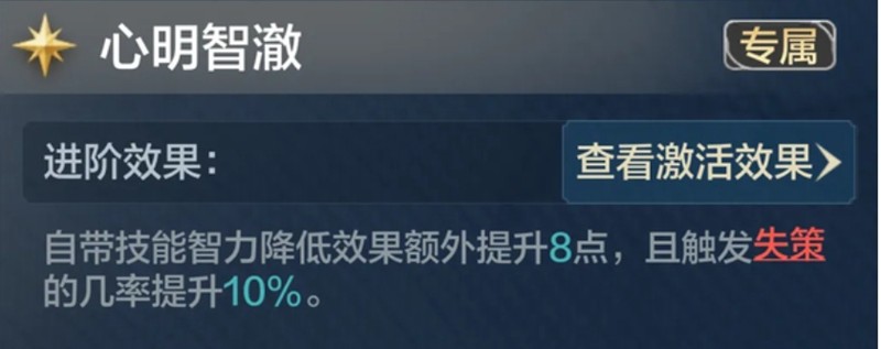 诸葛亮的自带技能"奇门遁甲"在战斗开始后每回合都会降低敌方全体的智力属性,这个效果无法被驱散,对中速法核队有着极强的克制作用。在奇数回合开始时,他会随机对两名敌军施加"失策"和"徒劳"状态,分别有50%和30%的几率打断主动技能和追击技能。当这些状态成功触发时,诸葛亮还会对目标造成150%的智力伤害,伤害值还会受到双方智力差值的影响。