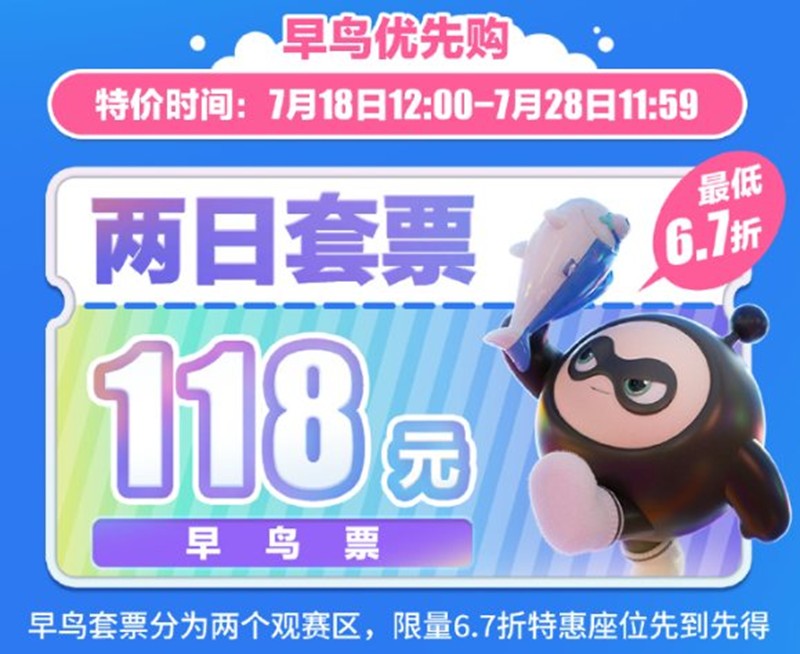 7月18日-7月28日11点59分为早鸟购票期,最高可享6.7折优惠,心动的蛋仔快快行动!购票就享价值300元+的基础礼包:高于票面价格的彩虹币、典藏外观自选*1等好礼等蛋领取!更有赛事定制迷你奖杯、应援棒等观赛装备免费送。特别提醒:附赠外观道具及周边福利都需在线下比赛现场兑换哦~