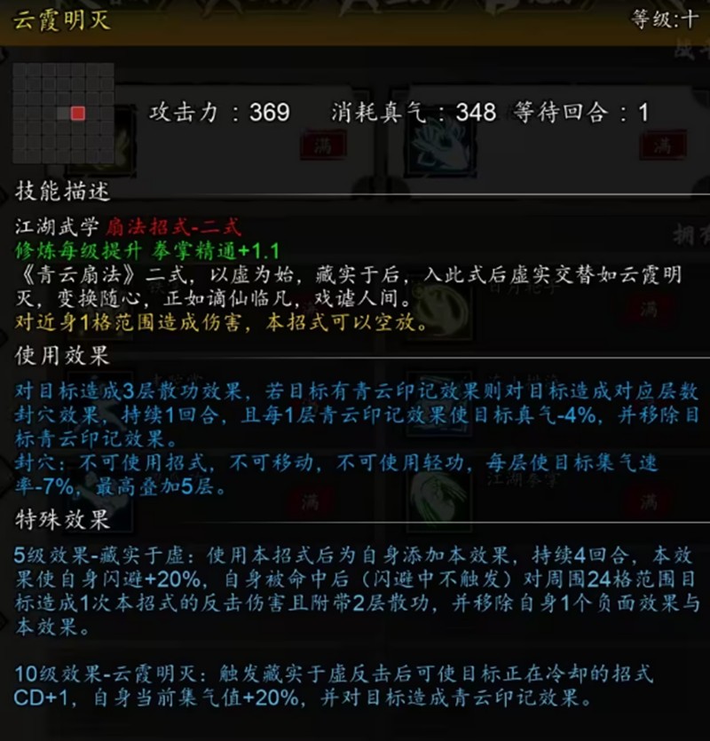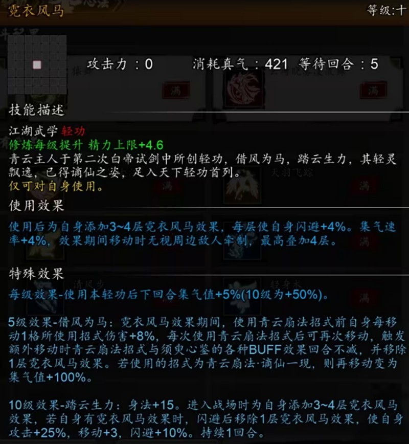 在生存能力方面,青云传承通过多种心法和轻功的叠加,可以获得极高的闪避数值。灵动、猿舞、霓衣风马等状态相互配合,再加上部分心法提供的负面状态免疫效果,使得这个流派在战斗中拥有出色的容错率。