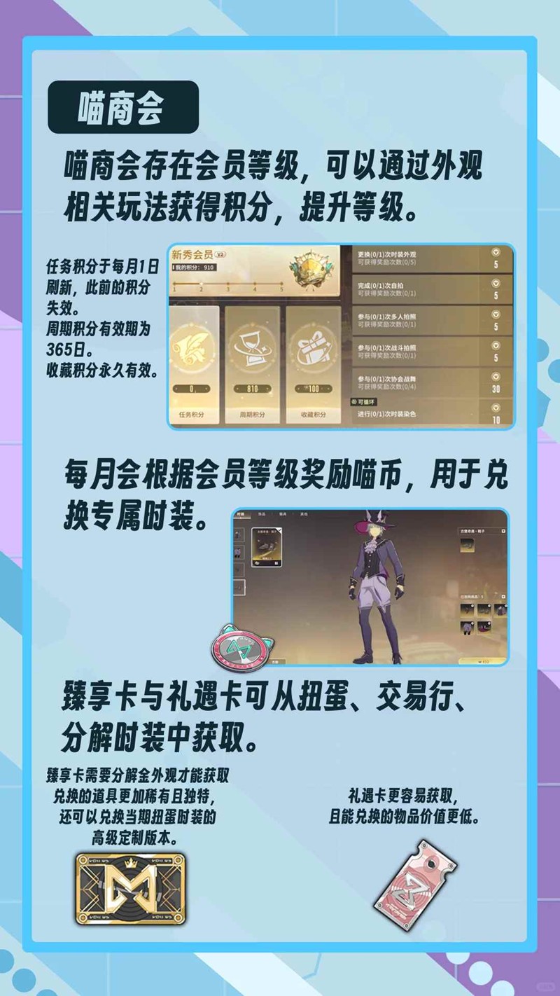 喵商会存在会员等级,通过收集新时装、载具幻想、武器皮肤,参与外观相关的玩法,领取收集度奖励等方式可以获得会员等级积分,提升会员等级。其中积分分为任务积分,周期积分,收藏积分