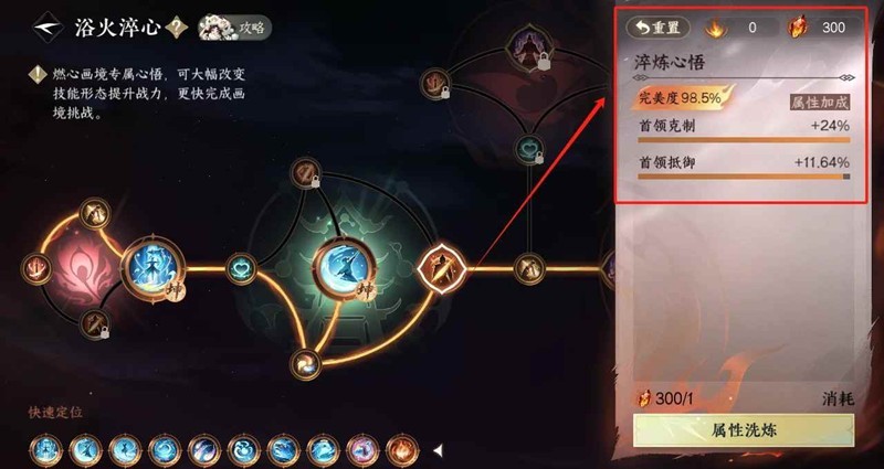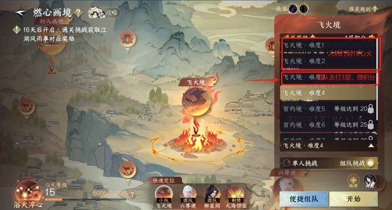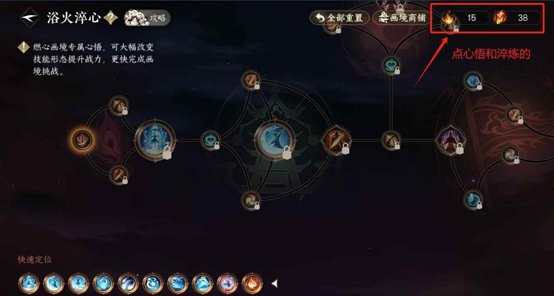 进入燃心画境先过剧情“初入画境”,然后单人人机过飞火境难度1,刷到5级心火,点下方浴火淬心点出需要的心悟。