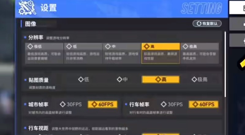 进入雷索纳斯游戏主界面后,点击左上角的玩家头像图标。在弹出的个人信息界面左侧,可以看到一排蓝色功能按钮,倒数第二个就是设置选项。点击进入设置页面后,就能看到详细的画面参数调节选项。这里包含了分辨率、贴图质量、城市帧率、行车帧率以及行车视距等多个可调节项目。