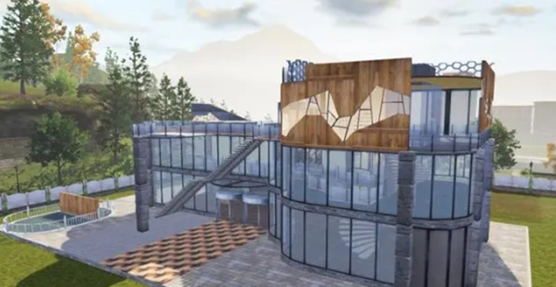 这次更新的双人建筑蓝图采用了新科技设计理念,整体呈现为一座大型购物中心。建筑外观极具视觉冲击力,入口处设计了精致的玻璃旋转门,搭配银色门框显得格外大气。顶楼采用开放式结构,流畅的线条设计让整个建筑充满现代感。