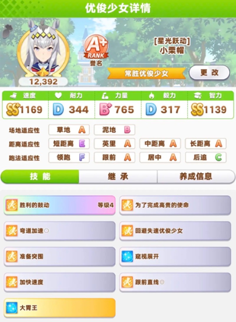小栗帽在草地和泥地两种场地表现尤为突出,虽然她的领跑数值不错,但实战中跟前跑法更能发挥她的优势。她的耐力属性特别适合中长距离比赛,稳定的耐力条让她在持久战中更具优势。
