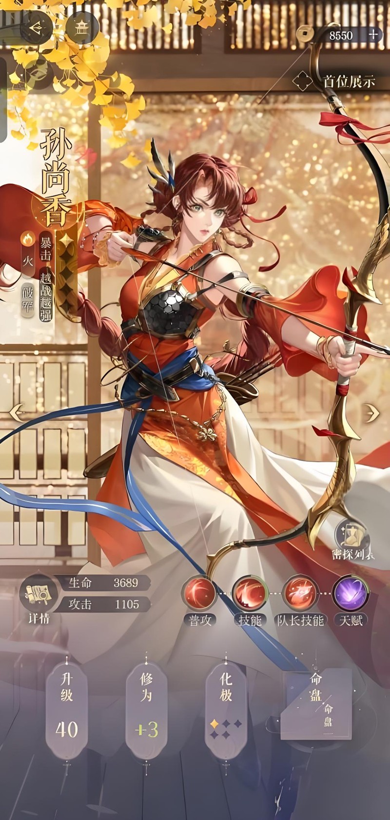 孙尚香在如鸢中定位为火属性破军角色,拥有极强的输出能力。她的普通攻击"挽弓"能造成60%伤害并附加灼伤效果,技能消耗4点能量可打出225%以上的攻击伤害。作为队长时,还能提升全队15%的实力。这样的技能组合决定了她在队伍中通常担任主C位置。