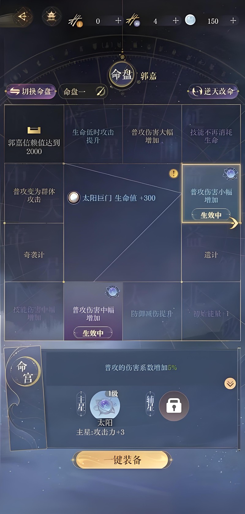 他的命盘中拥有奇袭计特性,能让队伍首次技能视为普攻,配合叠加减伤后一波爆发带走敌人。40级时郭嘉的合击伤害能达到两三千,是团队输出的核心保障。在配队时需要注意郭嘉释放大招会消耗自身血量,必须搭配治疗角色。