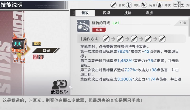 胡萝贝的战斗核心在于她的机械伙伴"耳光",这个战斗单位可以进行多种形态切换。普通攻击分为五个阶段,初始攻击倍率为792%,最高可叠加至3300%的惊人伤害。每次攻击都附带42点额外属性伤害,并且具有击退效果,最多可连续击退目标四次。这种递增式的伤害机制让胡萝贝在持续输出时能造成可观的爆发。