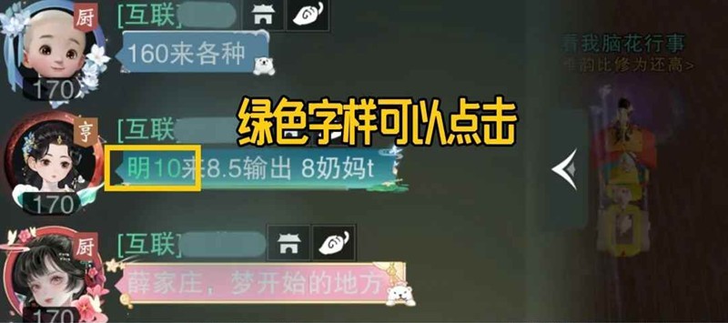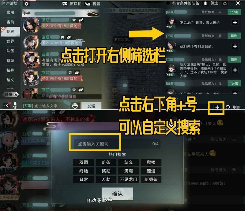 世界频道有很多“xxx来人”的黑话,新出了黑话搜索功能如图1。点击绿色字样可查看同类型喊话,或在左侧队伍栏点击便捷组队,点击玩家头像可申请入队