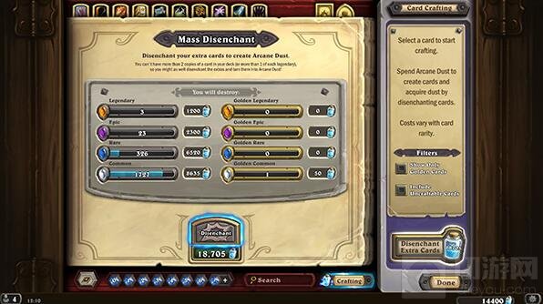 这里是他的卡牌制作界面,完全通过对战获得了总共33105点奥术之尘。