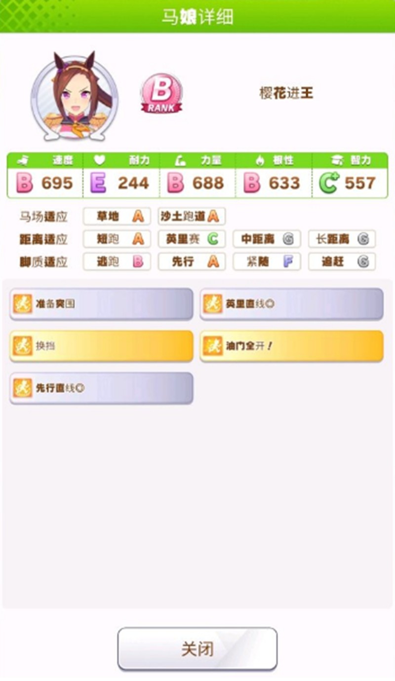 樱花进王的场地适应性主要集中在草地和泥地,跑法建议选择逃跑或先行。在技能加点方面,专注于提升速度相关的技能即可。作为一星马娘中的佼佼者,她在中短程比赛中能发挥出惊人的实力,特别适合新手训练员用来攻克URA赛事。