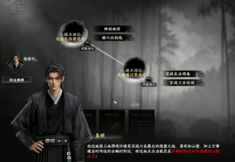 最后一个线索是精巧钥匙和神秘地图的组合。钥匙需要将上下两个部件在背包中合成,然后与地图搭配使用。当所有线索收集齐全后,玩家需要前往飞炼瀑上方的山洞,解开入口处的五行石阵谜题,就能进入隐藏区域探索百战刀圣的秘密。