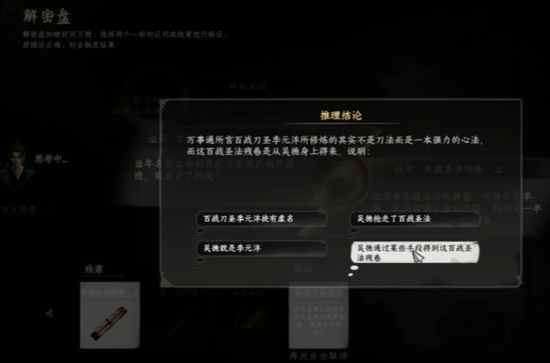 第二个线索百战圣法残卷分为上下两卷。上卷需要在主线剧情中击败BOSS吴德后获得,同时还会得到一封与伯子越相关的信件。将这封信交给伯子越并完成与他的战斗后,就能获得残卷的下卷。这两部分残卷组合后将成为推进剧情的重要道具。