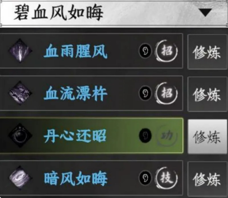 这套蓝色刀法以阴系内功为核心,拥有出色的生存能力。技能"血雨腥风"能在低血量时提供增伤效果,被动"暗风如晦"则能在血量低于50%时大幅减伤。这套刀法特别适合喜欢在危险边缘作战的玩家。