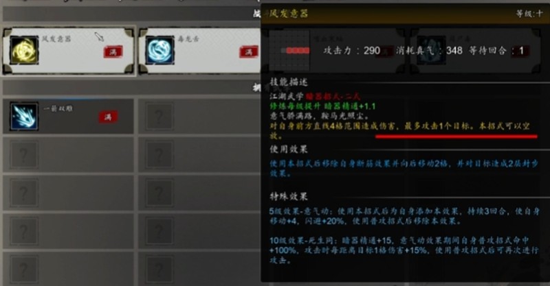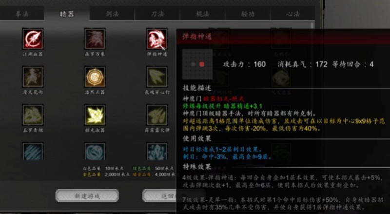 随着游戏深入,暴雨梨花针等强力招式会逐渐解锁。这个招式能攻击远距离五格内的敌人,命中后还能降低对方命中率并附加流血效果。金色品质的含沙射影可以对前方直线五格内的目标造成伤害,并有概率触发范围攻击,在BOSS战中能发挥关键作用。