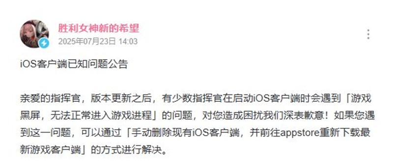 胜利女神新的希望7月23日更新已经完成,诸多活动内容已经上线,但部分ios系统玩家在进入游戏时出现黑屏问题,对此官方也是发布了最新公告,我们来一起看吧。