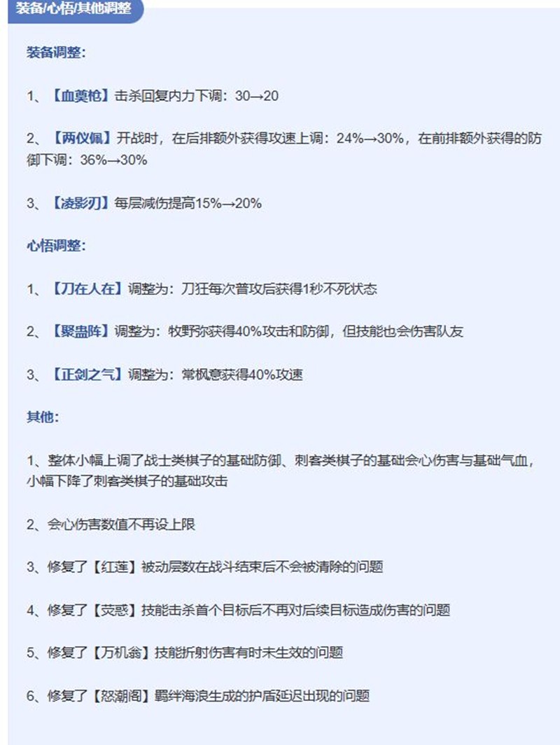 1、整体小幅上调了战士类棋子的基础防御、刺客类棋子的基础会心伤害与基础气血,小幅下降了刺客类棋子的基础攻击