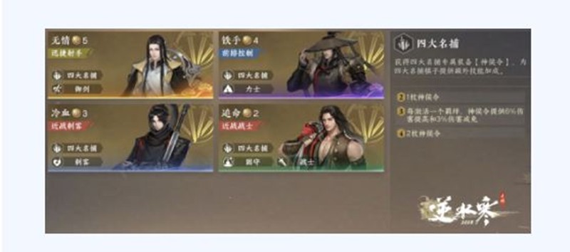 2、【四大名捕】【神侯令】对【冷血】的强化提高:75%会心→100%会心、对【追命】的强化提高:200/300/400%护盾倍率→250/350/450%护盾倍率