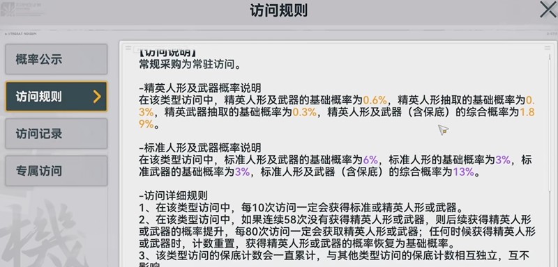 少女前线2追放的抽卡系统设有完善的保底机制。每次十连抽必定会获得至少一个标准品质的人形或武器。当连续58次抽卡未获得精英品质时,后续抽卡的精英出货率会逐步提升。精英品质的硬保底为80抽,一旦获得精英品质后,出货概率会重置。
