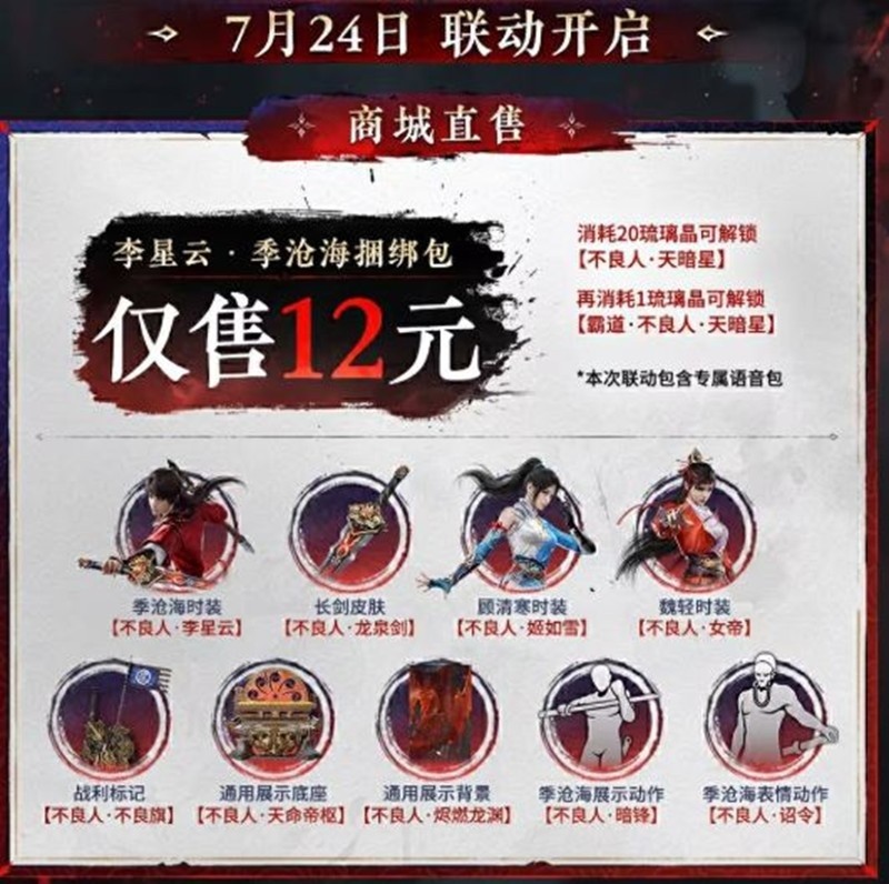 而在此次永劫无间手游与不良人联动中,李星云将以红衣、天暗星两套造型,携手挚爱姬如雪登场。同时,岐王女帝也将亲临聚窟洲。此外,还有更多联动外观将在未来随新英雄一同上线。7月24日至8月7日,完成任务即可免费领取联动外观。活动奖励包括顾清寒表情气泡姬如雪·出手、季沧海表情气泡李星云·不要、横刀皮肤不良人·唐刀等。