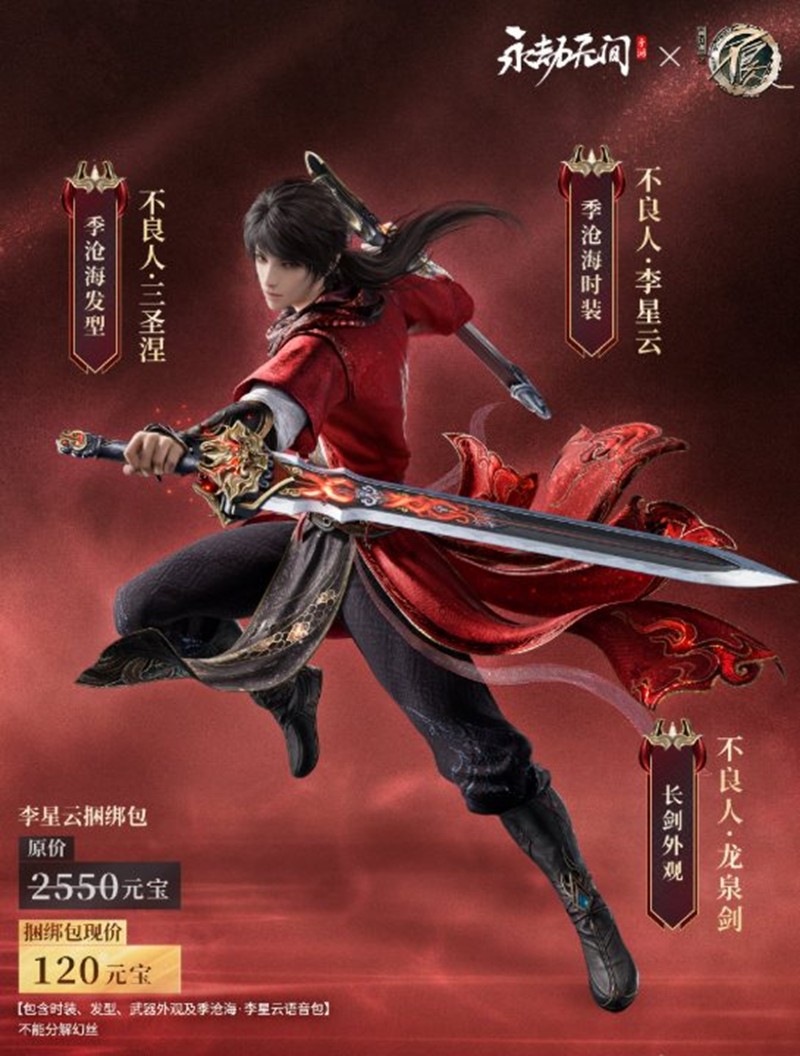 1、新增季沧海捆绑包【李星云捆绑包】。捆绑包内含季沧海极品时装【不良人·李星云】、季沧海极品发型【不良人·三圣涅】、季沧海极品语音包【李星云语音包】、极品长剑皮肤【不良人·龙泉剑】。捆绑包原价2550元宝,折扣价120元宝。单独购买对应单品即可享受折扣,购买捆绑包将享受更多折扣