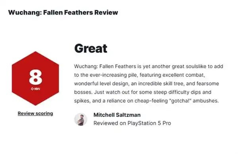 全球著名游戏测评网站IGN为《明末:渊虚之羽》打出了8分(优秀)的成绩,称赞其出色的战斗系统、精妙的关卡设计、令人惊艳的技能树体系以及极具压迫感的BOSS战。IGN简评称,《明末:渊虚之羽》为日益壮大的类魂游戏阵营再添佳作。