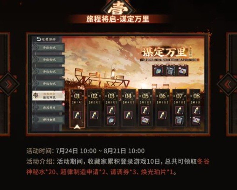 活动介绍:活动期间,玩家可以通过积累登录天数来获取奖励,总共可领取冬谷神秘水20、超律制造申请2、请调券3、焕光珀片1。