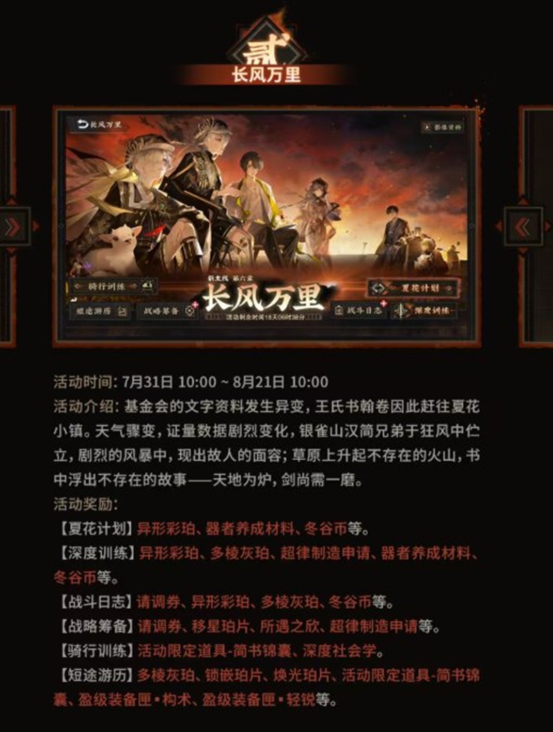 活动介绍:基金会的文字资料发生异变,王氏书翰卷因此赶往夏花小镇。天气骤变,证量数据剧烈变化,银雀山汉简兄弟于狂风中伫立,剧烈的风暴中,现出故人的面容;草原上升起不存在的火山,书中浮出不存在的故事——天地为炉,剑尚需一磨。