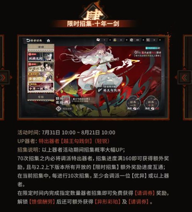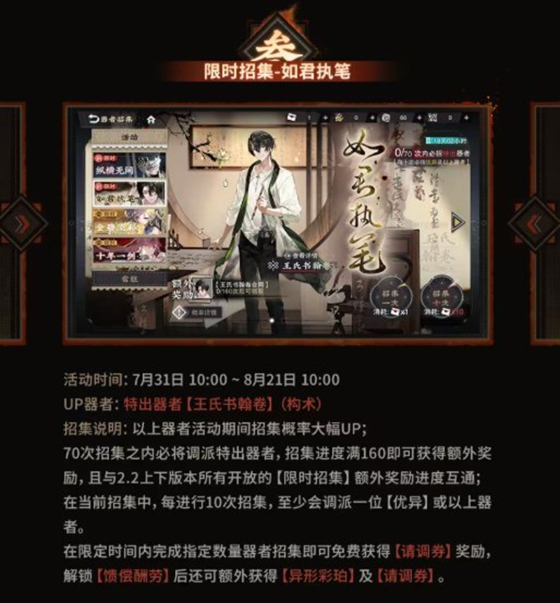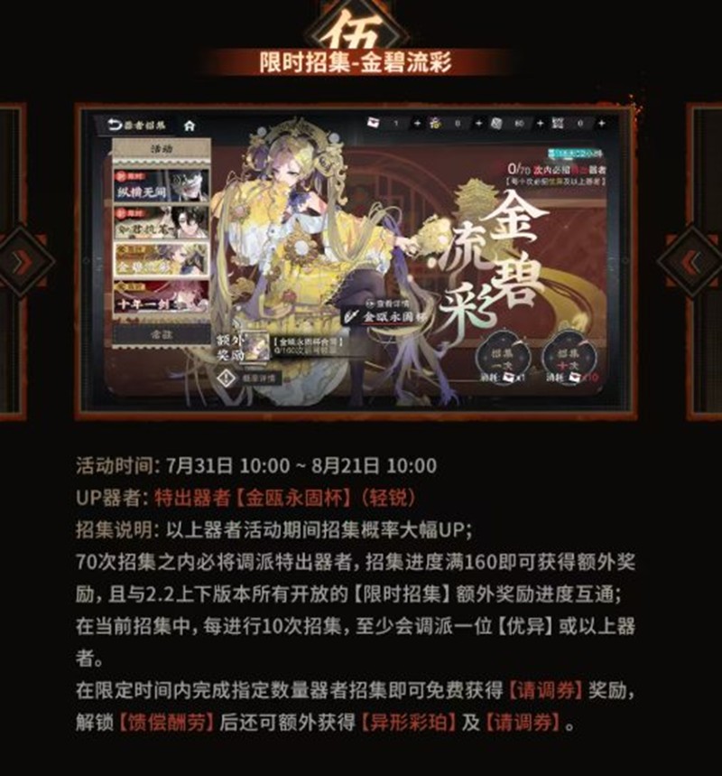 招募说明:以上器者活动期间招募概率大幅UP;70次招募之内必将调派特出器者,招募进度满160即可获得额外奖励,且与2.2上下版本所有开放的【限时招募】额外奖励进度互通。