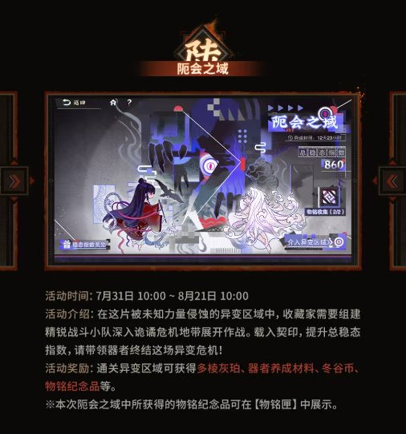 活动奖励:通关异变区域可获得多核灰珀、器者养成材料、冬谷币、物铭纪念品等。