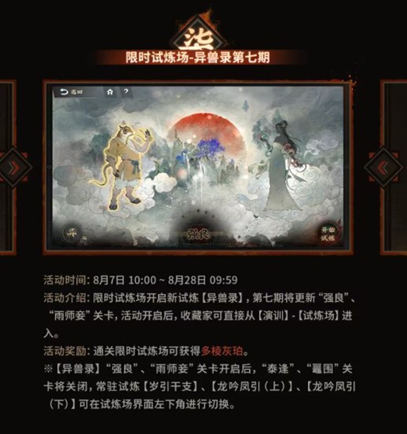 活动介绍:限时试炼场开启新试炼【异兽录】,第七期将更新“强良”、“雨师妾”关卡,活动开启后,收藏家可直接从【演训】-【试炼场】进入。