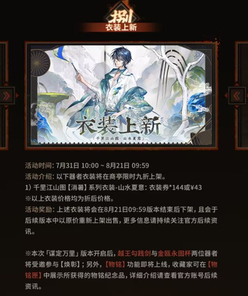 本次「谋定万里」版本开启后,越王勾践剑与金瓯永固杯两位器者将受邀参与【焕彰】;另外,【物铭】功能即将上线,收藏家可在【物铭匣】中展示所获得的物铭纪念品,详细介绍请查看官方账号后续资讯。