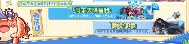 -【周末天降福利】活动8月1日-8月4日、8月8日-8月11日持续开启~完成任务即可获得「限时钻石」、「巅峰币」奖励!使用「巅峰币」可在【巅峰仙境】活动中兑换专属皮肤。