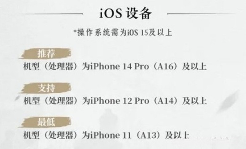 安卓设备玩家需要骁龙778G或麒麟985及以上处理器,运行内存8GB起步,系统版本需Android 7.1以上。iOS玩家则需要iPhone11(A13芯片)及以上机型,系统版本要求iOS15以上。这些配置能保证燕云十六声在移动设备上的基本流畅运行。