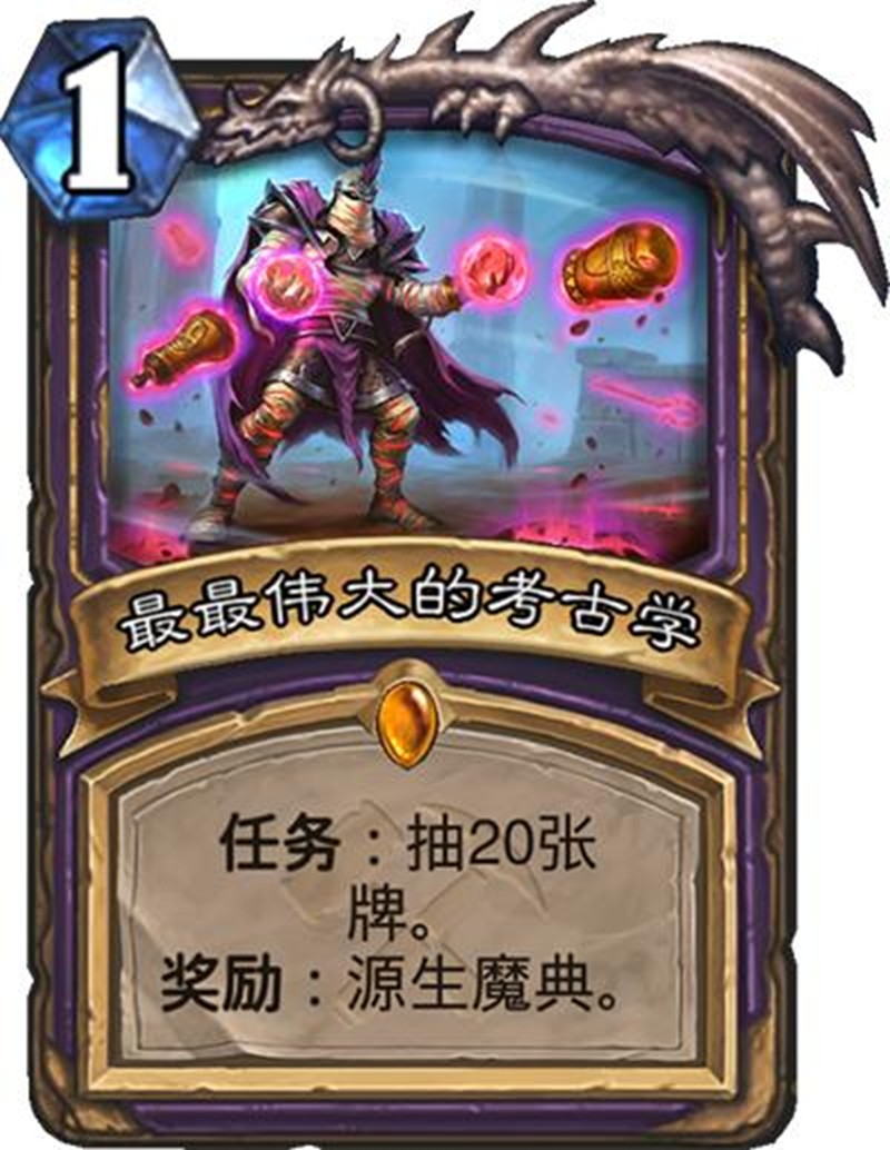 术士职业任务"最最伟大的考古学"需要抽取20张牌才能完成,完成后可以每回合获得一张0费牌。虽然效果强力,但抽牌过程中容易导致资源枯竭。