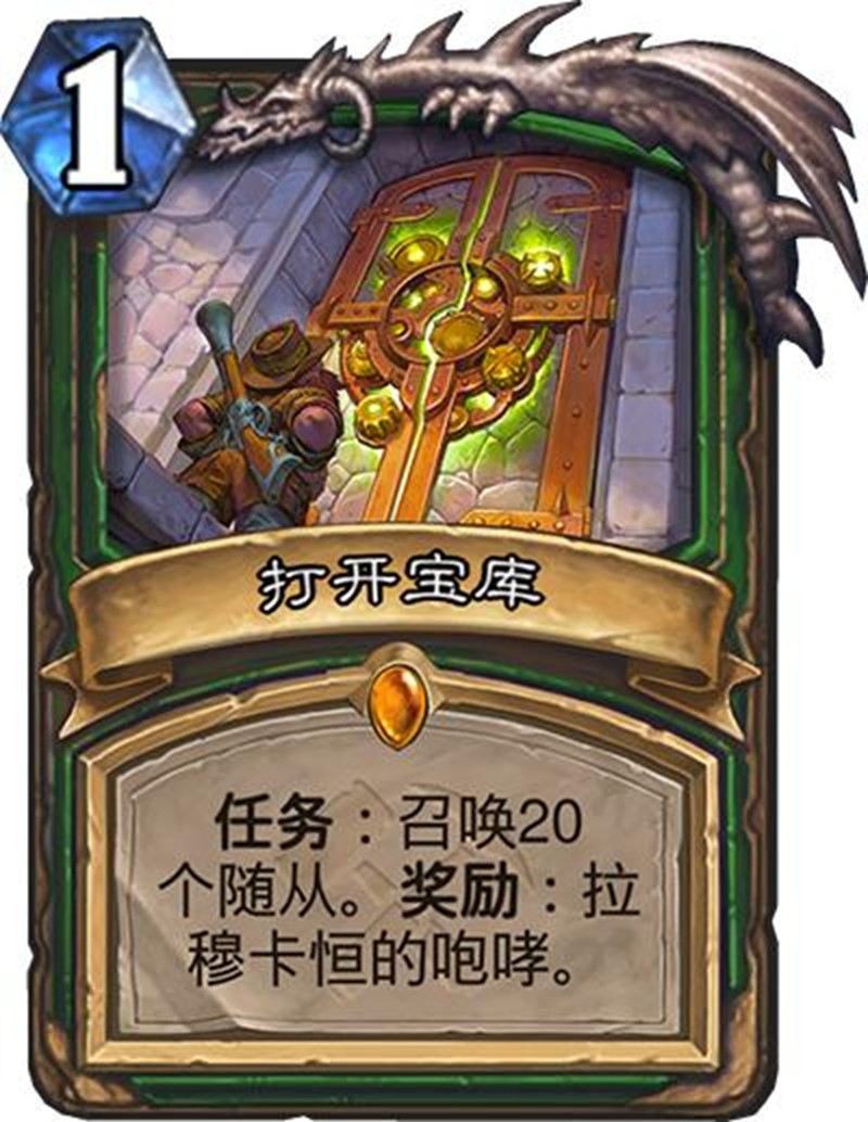 猎人职业"打开宝库"任务需要召唤30个随从,完成后可以获得每回合召唤2个4/3随从的效果,但猎人更倾向于快攻节奏。