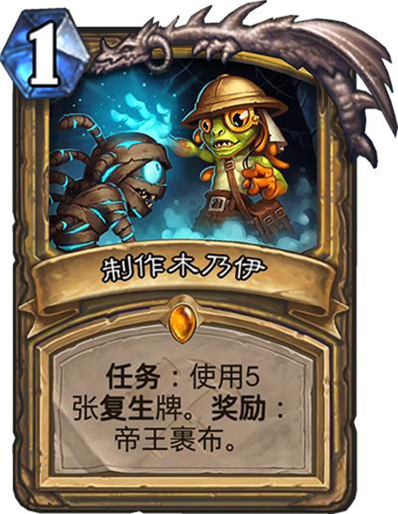 圣骑士"制作木乃伊"任务需要复活5个友方随从,完成后可以复制一个2/2的随从。目前骑士的复活体系较弱,需要更多优质亡语随从来配合。