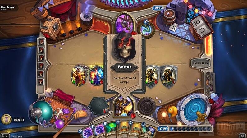 一般情况下,是无法通过疲劳杀死巫婆的,因为七费回合之后,巫婆会稳定抽到扭曲虚空,而且这些牌还不是从牌库里抽的(参考吐司视频),鬼知道她从哪抽来的……而且在回合结束之后,她还会再放一张扭曲虚空到牌库里去,等于说她的牌库是越来越厚的。