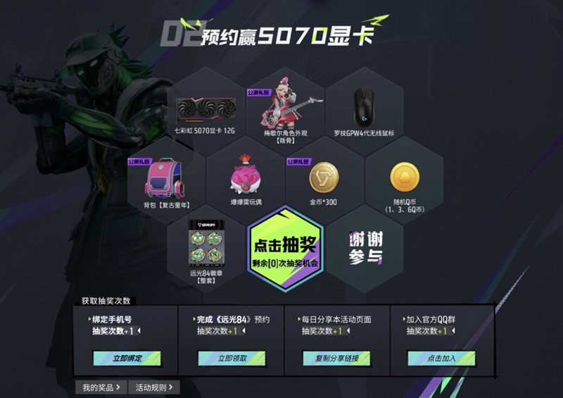 7月10日至7月28日期间,玩家通过预约游戏、关注官方账号、每日分享活动页面等任务可获得积分。每1积分可参与1次抽奖,奖品包含5070显卡等实物奖励以及游戏内道具。邀请好友注册可获得额外积分,最多可获得10积分。