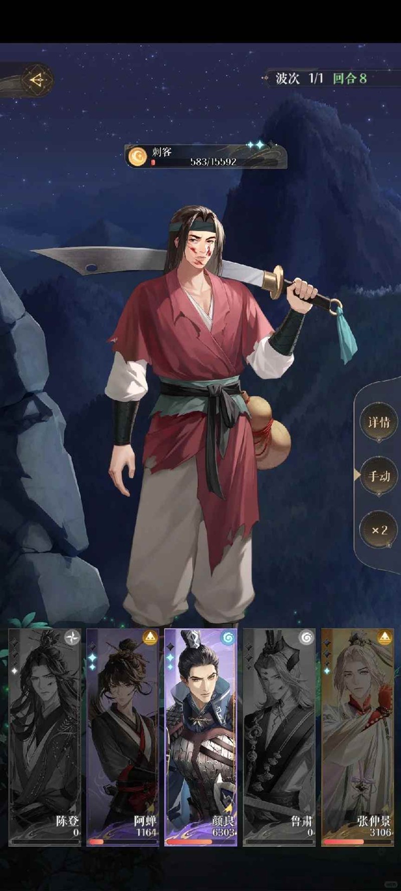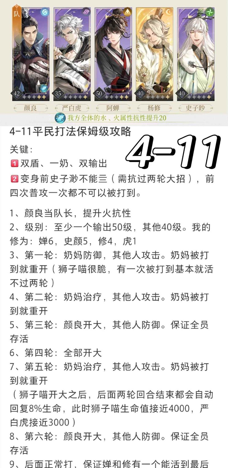 5、第四轮:优先打血最低的。颜良大招别乱用,敌人满星时颜良开大其他人防御。敌人嘲讽时我方不要放大招。后面我四个都没亖,过了