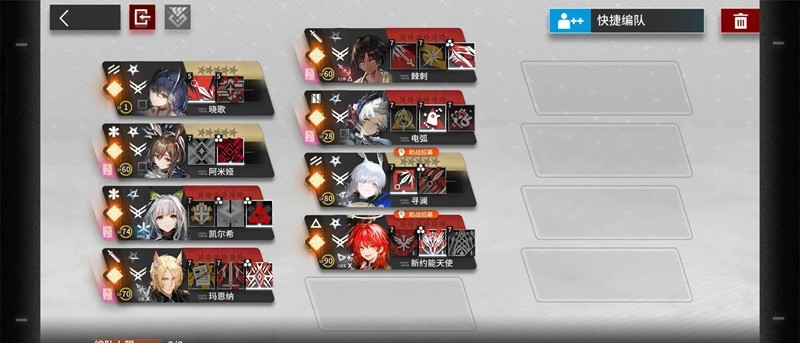 n1后备分队有八费,可抓酒神拉狗医兔(8费),无酒神也可抓新能电弧豆苗(8费)。n2地面分队有六费,可抓新能电弧情报官(6费)。n3近锋分队有六费,可抓银灰精二医兔深海色(6费)。