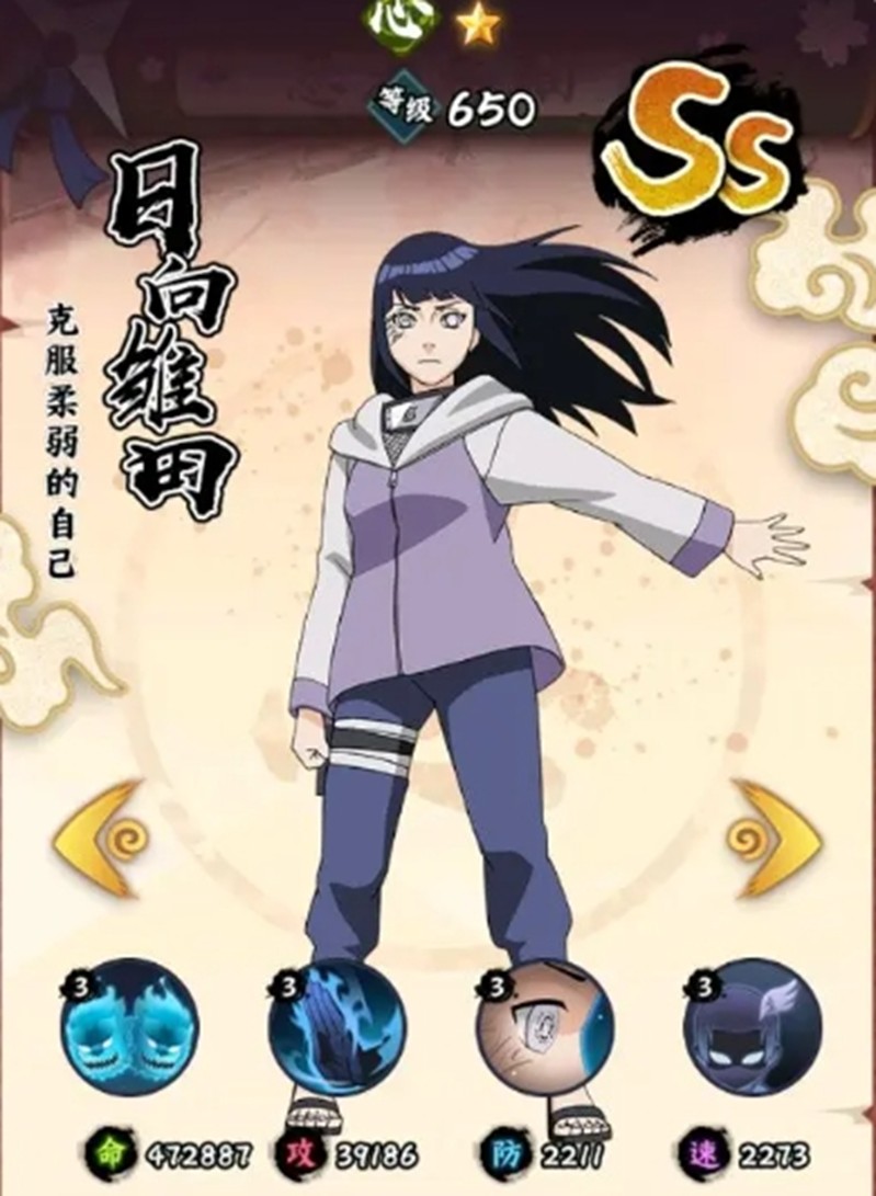 日向雏田在游戏中是一位爆发型输出角色。她的主动技能柔步双狮拳能对单体目标造成396%的高额伤害,同时100%概率附加破甲效果,降低目标20%防御持续2回合。被动技能柔拳让她对破甲目标的伤害提升40%,白眼和速度强化则分别提供20%暴击率和20%速度加成,使她在战斗初期就能占据优势。