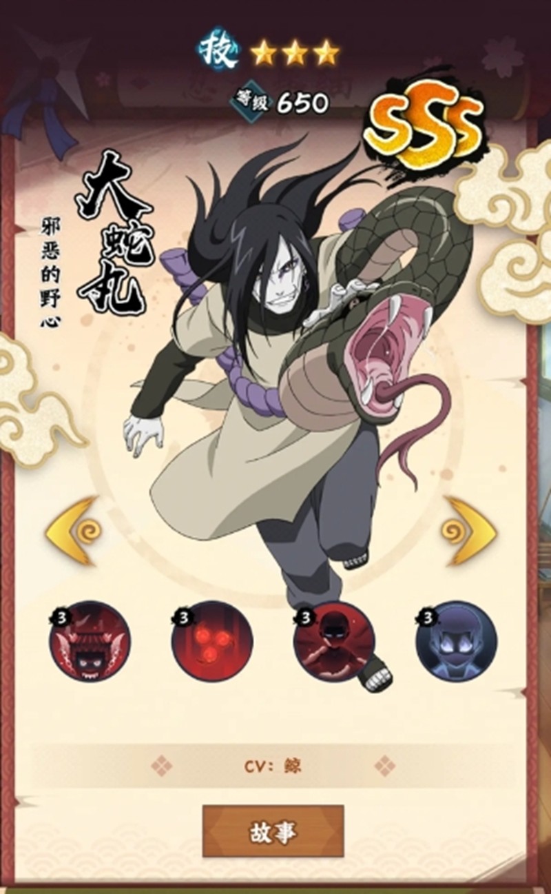 大蛇丸是一位攻守兼备的强力角色。他的三重罗生门能对敌方全体造成100%伤害,并有50%概率获得抵御效果。咒印术被动让他在受到攻击时有概率给敌人附加咒印,阵亡时还能造成额外伤害并复活。白蛇吸收和坚毅不屈被动大幅提升了他的生存能力,使他在战场上能持续发挥作用。