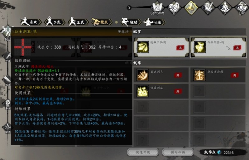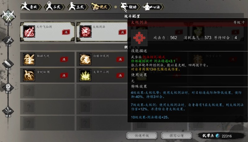 江湖流派剑法在基础剑法上增加了更多战术变化。松风穿林剑法是这类剑法的代表,攻击范围扩展到前方直线三格,使用后还能继续移动。每次命中敌人可以回复少量气血并提升移动力,在战斗中具有很好的续航能力。