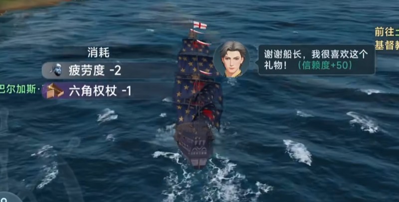 另一种送礼方式是在海上航行时随机触发。当船长们在海上遇到突发事件并成功解决后,航海士头像旁边会出现可点击的礼物图标。只要背包里携带了该航海士喜欢的礼物,就能立即赠送以提升信赖值。这两种方式都需要一定的运气成分,但都能有效提升航海士的好感度。