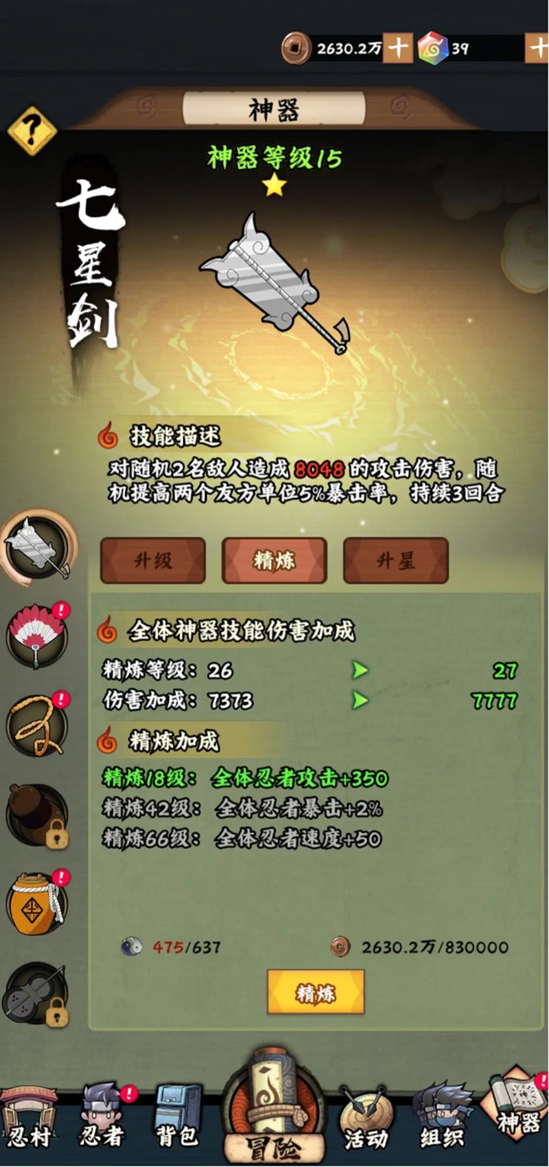 神器不仅能提供主动技能,还能为全队带来属性加成。新手完成主线任务会获得第一个神器,后续神器需要通过特定条件获取。神器可以通过升级、精炼和升星来强化效果,升级消耗强化石和铜币,精炼需要精炼结晶,升星则需要同名神器作为材料。