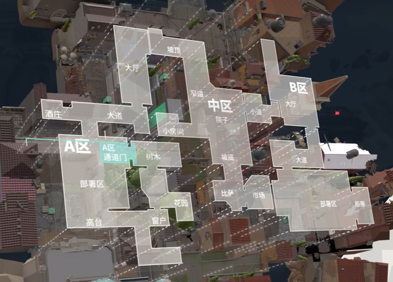 亚海悬城地图整体分为A区、中区和B区三个主要区域。在AB区的边缘位置设置了可开关的通道门,这个特殊机制为攻防双方都带来了更多战术选择。玩家会从地图的南北两侧出生点出发,目标是通过团队配合争夺部署区的控制权。