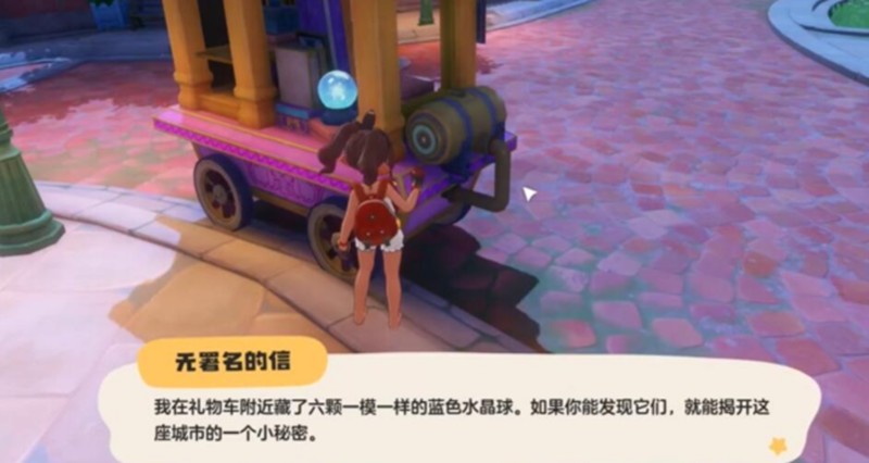 第四个水晶球在隔壁街店铺右侧的玩具雕像肩膀上,需要攀爬技能达到3级才能拿到。第五个水晶球需要激活广场中央建筑物附近的地底机关。最后一个水晶球要回到摊位左边,在绿色商店门口解开颜色匹配机关才能获得。
