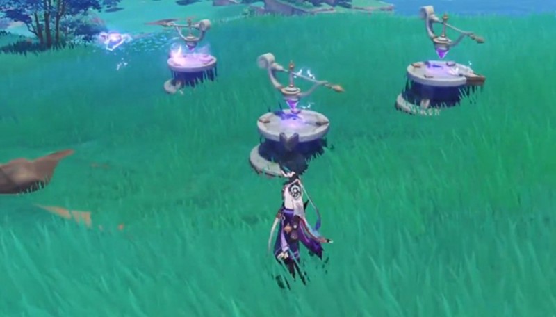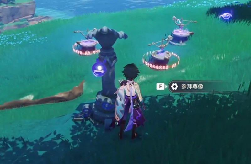 在曚云神社草地上可以看到三个指针和一尊海祇尊像。首先需要参拜这尊佛像,随后会出现一个移动的雷灵。当雷灵停在左侧时再次参拜佛像,这时第一个雷灵会固定位置,同时出现第二个雷灵。此时左侧指针对应左侧雷灵,右侧雷灵会移动到对应位置。