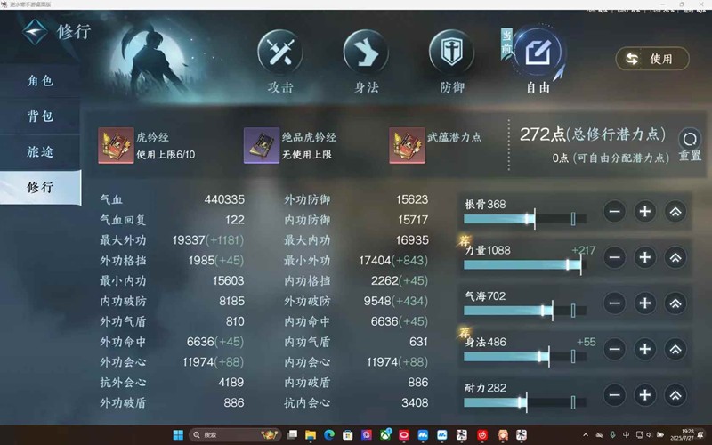 修行中的加点需先选择自由加点,然后全部点力量,剩下的点身法(这里需根据不同职业有些职业是气海)